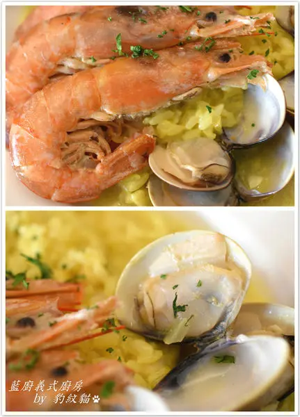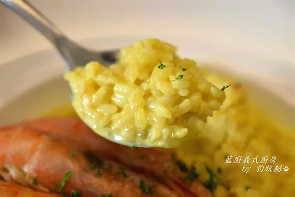 義大利米加入固定比例台梗九號,結合兩者米種優點。【藍廚義式廚房】煮飯前還用了點小心機,讓米心更有膨鬆感好吸收醬汁。奶醬中的鬱金香粉,替米粒披上一件淡黃高雅外衣。鬆香的燉飯,不僅花香四溢,還有乳酪之王<帕米吉安諾-雷吉安諾>助陣。