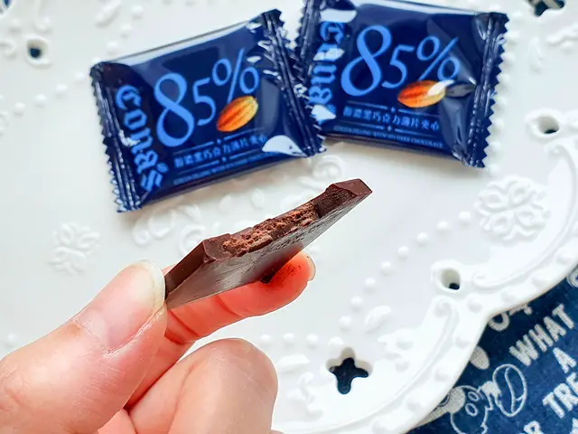 夾著85%的內餡,含在嘴裡慢慢融化,流露出苦甜風味,更能品嚐出巧克力獨特的醇厚溫潤