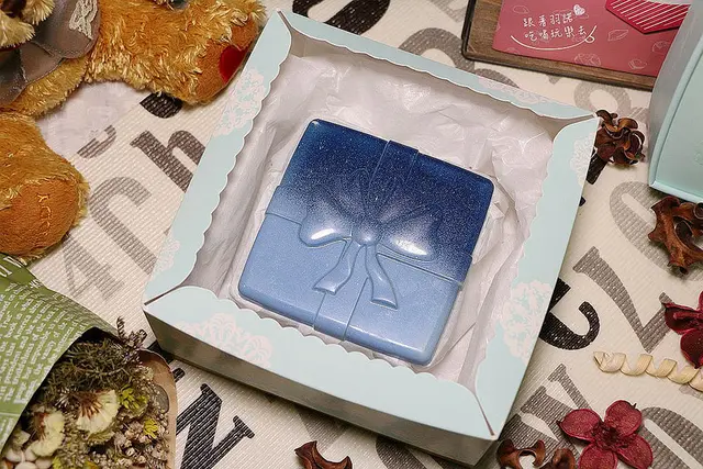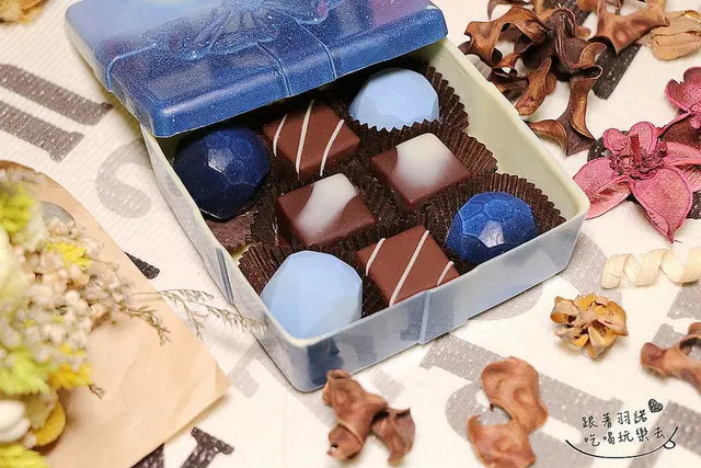 裏頭的巧克力分別為粉藍鑽石 深藍鑽石 潑墨設計及領斜設計