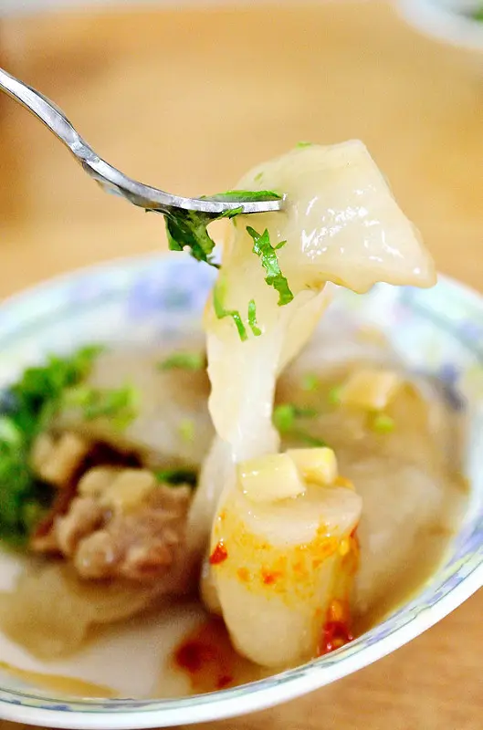 使用在來米漿加上一定比例的番薯粉作成外皮,淋上同是在來米作成的白醬
