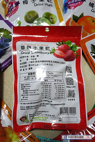 每一包果乾都有清楚的產地、使用原料、添加物和熱量標示,每種口味重量不同,所以熱量也不同