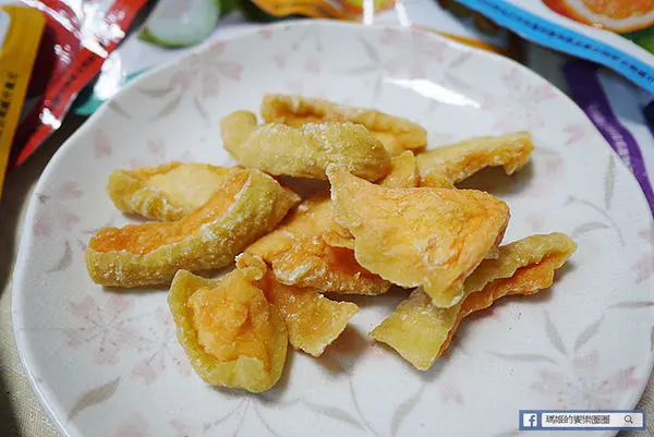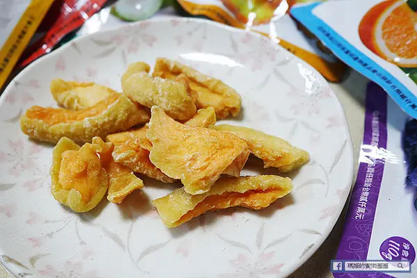 「哈密瓜果乾」還可以看到果肉原本的色澤,果乾在乾燥烘烤的過程中,主要加了糖、鹽和食用醋去製作,符合國家的食品規範