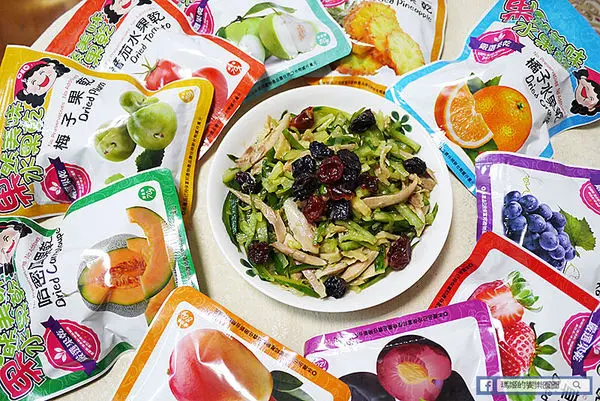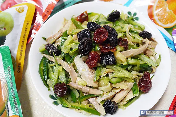 把果乾加在涼拌菜在適合不過了,把切成絲的小黃瓜和雞肉絲加入鹽、糖和醬油拌勻,再加入果乾攪拌在一起靜置15分鐘左右入味就能上桌,吃起來除了鹹味外,還多了果香和酸甜味,挑嘴的老爸都說這樣好吃哩!
