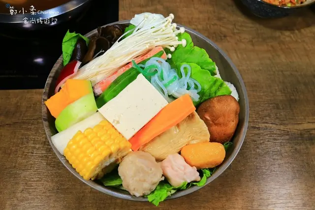 每鍋都會附贈一組菜盤,食材有金針菇、南瓜、白蘿蔔、