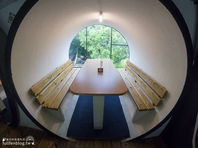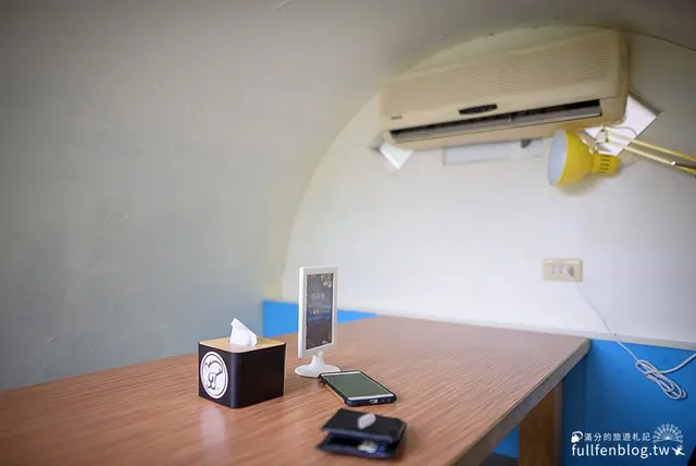 水管屋裡有餐桌、坐墊、冷氣和台燈