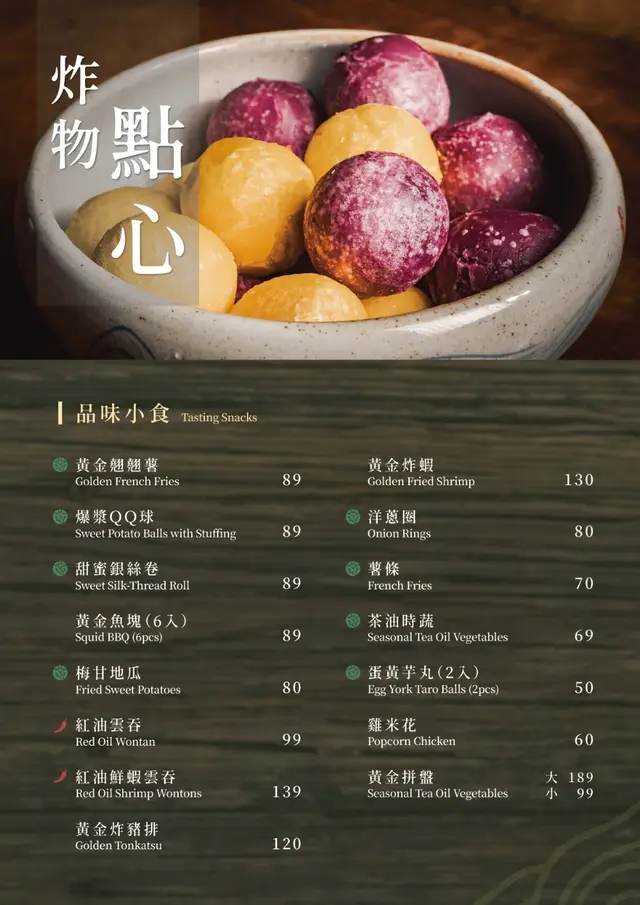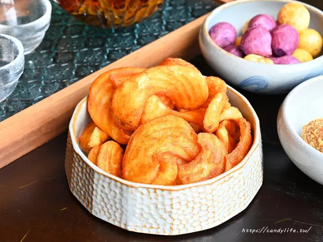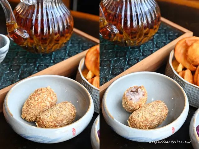 採用大甲芋頭製作而成的芋泥餡,裡頭還包入鹹蛋黃,外皮炸至香酥脆口,內餡芋泥超綿密,芋頭香氣十足,交織著鹹蛋黃的迷人鹹香,這道糖糖超喜歡,芋頭控必點