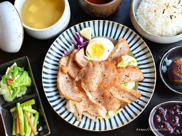 金雲堂人文茶館的焱燒六兩定食其實就是松阪豬定食,松阪豬是豬頸肉部位,因一頭松阪豬只能取下200至300公克的肉,又稱為黃金六兩,這也是這道焱燒六兩定食的由來,金雲堂人文茶館的定食除了白飯及主食,還有附上湯品、沙拉、時蔬、茶品及甜點,餐點還蠻豐盛的