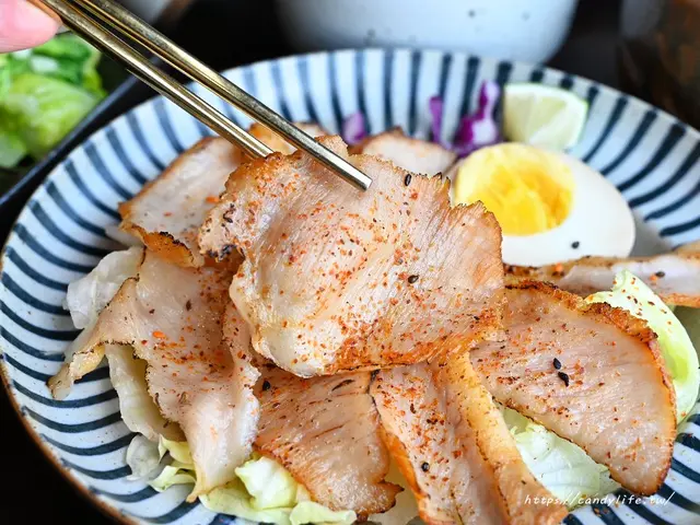 將松阪豬切成薄片狀,採炙燒方式,將松阪豬兩面煎至微微焦香,最後撒上七味粉,口感Q彈香脆,豐富油脂在嘴裡爆開來,讓人越嚼越香,帶有炭烤香氣,底下還有附上爽脆生菜可以搭配享用,口感豐富,去油解膩