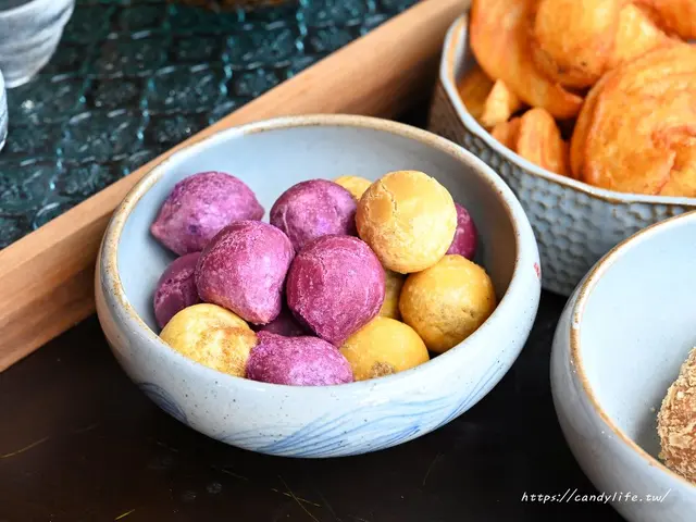採用黃金地瓜及紫地瓜製作而成的QQ球,口感Q彈,咬下去還會大爆漿,吃起來帶有迷人的地瓜香,喜歡吃包餡的地瓜球一定要點