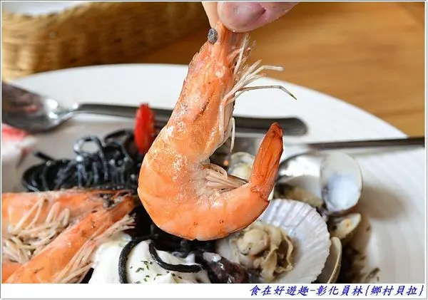 海鮮蛤蜊墨魚麵.三隻大蝦搭配墨魚還有舖滿半個盤子的貝類,用料豐富