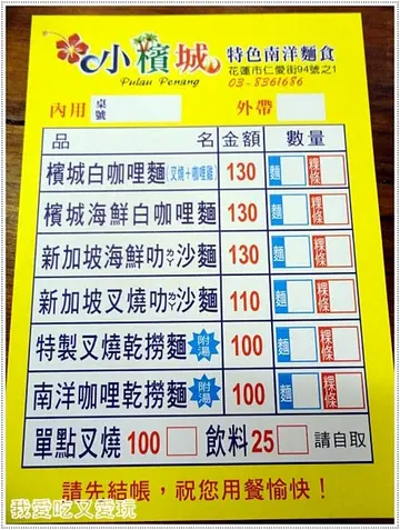 在仁愛街一碗小的舊址 最近開了一間新店 他們是主打南洋風味 因為我媽媽以前煮的菜 就有這樣的元素在 所以我對這樣的味道接受度很高 這種異國風味也頗感興趣 就去吃了!店內店外環境菜單新加坡海鮮叻沙麵(130)一上桌 就可以感受到南洋香料的氣味恩嗯~他的湯頭對我來說略鹹了一些 不過一入口 就可以感受到南薑 香矛和椰漿的味道 味道其實還蠻不錯的ㄟ 不過如果香料味能夠再強一些我會更喜歡他們可以選麵或是粿條 我是選了麵條 因為他們的湯頭味道比較鹹一些 所以麵條還蠻夠味的單點叉燒(100)看起來真好吃啊他們家的叉燒真的非常好吃啊! 應該這麼說 他上面不知道淋上什麼醬 那個醬把整個叉燒味道都提升起來了 而且叉燒本身口感很好 入口不會柴 這個真好吃啊 必點特製叉燒乾撈麵(100元/附湯) 叉燒給的量蠻夠的^^乾麵是有附湯的我們看麵的顏色 預期他會很重口味 但是一吃.......嗯 沒啥味道==" 感覺是有調味 當然他是要搭配叉燒吃是沒錯 但是吃起來就很沒感覺南洋咖哩乾撈麵(100元附湯)問題一樣的 還是說咖哩的醬給多一點 裹在麵上會更好?或是麵本身的調味要增加 咖哩雞味道還不錯檳城白咖哩麵(130) 這是是有叉燒和咖哩雞2種ㄟ 一次可以吃到2種的感覺真好^^他們有附上一盤叻沙醬 吃到一半可以加進去試看看 我單吃一點 嗯 味道有點怪 應該不能單吃恩嗯~他們的白咖哩麵好吃ㄟ^^ 湯頭味道很順 味道很剛好 好喝因為我不知道叻沙醬加下去味道會怎樣 我先用一湯匙的湯試了一點 嗯...味道怪怪的==還是不要加好了 喝到剩半碗湯 還是給他全加下去好了 這樣比較準!!!我就全加下去!!ㄟ~~還蠻好喝的ㄟ 味道變化蠻多的 香料的風味讓湯的味道更豐富 好喝 不過會變有一點點辣 不吃辣的要注意雖然說乾撈麵我覺得味道淡了些 但是他的湯麵類和叉燒表現得很好啊 是會讓我想來第2次的店 尤其叉燒淋上那個醬真的是對味啊 真好吃 他那個鹹度 如果配飯我一定超愛啊^^ 大家有機會可以去吃喔!…查看更多