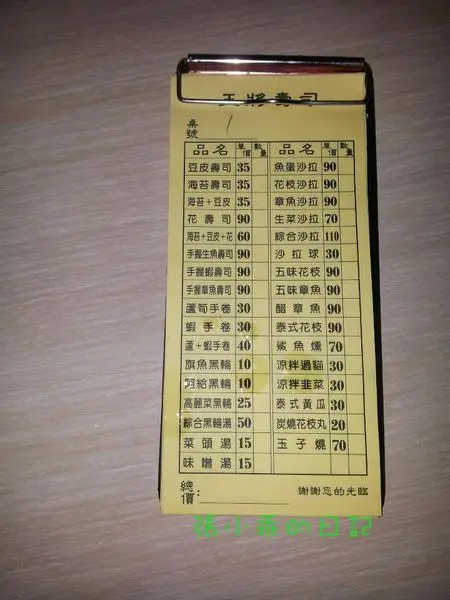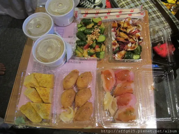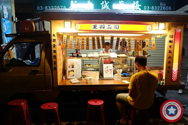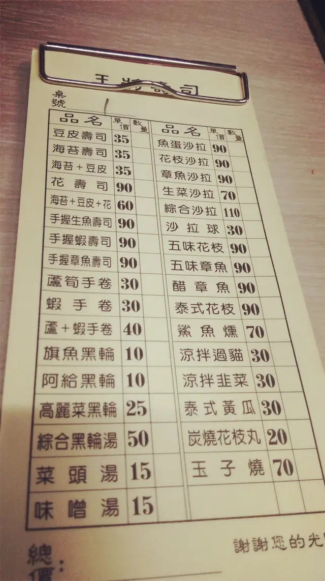 夜晚的花蓮有著不一樣熱鬧的風景 這間王將壽司在每天晚上10點之後才會出現在中華路上就在名產店惠比須的對面已經開很久了 不過生意越來越好本來只有一個騎樓的現在桌子擺了兩三個騎樓還常常客滿呢 外帶的話餐車旁有菜單如果是要內用每張桌子上都會有菜單直接點了以後把最上面那張抽起來給老闆娘就好玉子燒(NT.70) 層層堆疊的玉子燒帶有高湯的甜味及香氣若覺得不夠鹹會附上一盤醬油以供沾取魚蛋沙拉(NT.90)底層鋪了高麗菜司後將魚蛋切片淋上美乃滋一旁附贈店家的馬鈴薯沙拉是說我怎麼覺得以前吃到的馬鈴薯沙拉較為綿密魚蛋也比較香T^T海苔壽司(NT.35)基本款的海苔壽司已做好放在櫃中點完餐即切片上桌一份有五片手握生魚壽司(NT.90)一直很喜歡這種直接在生魚片上抹上醬油的吃法生魚新鮮沒什麼腥味不過醋飯倒是沒什麼醋味蘆筍手捲(NT.30)手捲的內容是馬鈴薯沙拉高麗菜絲及蘆筍建議上桌立即食用海苔才不會軟掉喔味噌湯(NT.15)吃日式料理總覺要來碗味噌湯暖胃不過是說是隔一陣子再訪王將好像和記憶裡的味道稍嫌不同了.......…查看更多