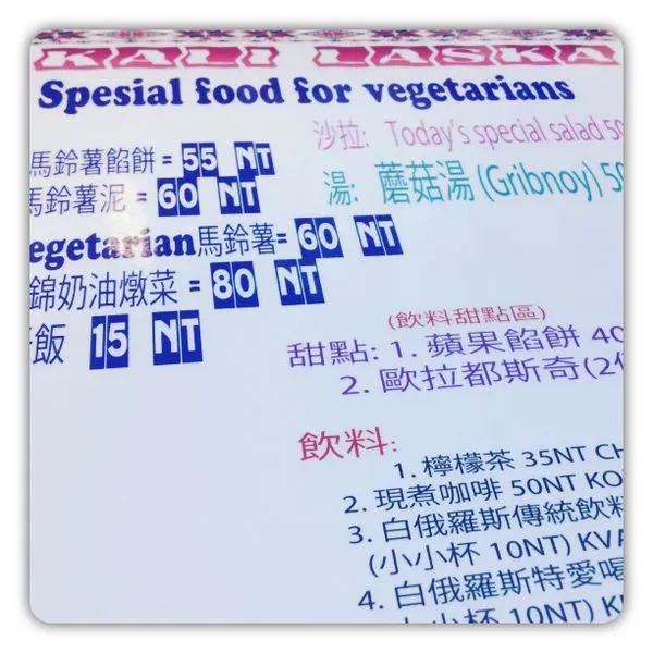 久聞花蓮市有一間白俄羅斯餐廳,終於愛嚐鮮的我們三個人來這晚餐約會。是說這外觀還真顯眼,是異國風嗎? 店內大概只有四桌吧,老闆和老闆娘都是白俄羅斯人,有一種家庭式餐館的感覺。裝潢也很簡單,白俄羅斯傳統服裝和一些照片。因為我們三個人都吃素,還好他們有提供素食菜單,不過可以選擇的就比較少了。另外菜單有的不是很懂,老闆也會熱心介紹喔! 第一個上的是蘑菇湯,好大一碗,主要是馬鈴薯和薏仁,奶油口味還不錯。 馬鈴薯餡餅,其實就是薯餅啦!煎的薄薄脆脆的,很好吃! 奶油燉蔬菜,是花椰菜和紅蘿蔔,奶味不會很重,但有點鹹,要配飯會比較剛好。 Vegetarian馬鈴薯,其實就是煎的馬鈴薯塊加上一點泡菜。泡菜跟台式有一點像,馬鈴薯塊也蠻好吃的,但一樣有點鹹要配飯。所以,我們叫了兩碗飯,請注意,這裡的一碗飯好大一碗(跟湯碗一樣大),所以一碗其實是一般的兩人份大小。好加在,只有叫兩碗,不然真的吃不完。 這個甜點叫歐拉都斯奇,像是麵粉餅有點酸酸的(老闆娘說有加優格),上面是草莓醬。只能說口味太特別了,說不上好不好吃耶! 這是老闆娘推薦的白俄羅斯傳統飲料叫做可貓斯,他說是紅茶發酵的。有聽沒有懂,喝起來沒有紅茶味,反而有一點像蘋果汁,算是特別又好喝的! 這就是普通的檸檬茶啦!其實是怕可貓斯不好喝,所以點了一杯正常版飲料,沒想到可貓斯好喝啊! 這家店就只有老闆夫婦兩人包辦,所以人多好像有點忙,不過服務態度是不錯的!料理的話,因為我們吃素,所以大多是馬鈴薯(不過馬鈴薯也就是他們的主食),沒什麼選擇。如果一般菜單的話,選擇可就多了,所以喜歡異國料理的朋友,倒是可以去試試看!我們三個人吃下來,很飽,總共540元,僅供參考。…查看更多