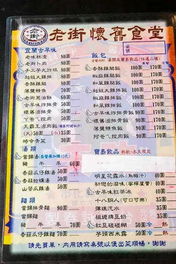 我們時常在頭城尋覓午餐,每當經過這家老街懷舊食堂就被它復古的外觀吸引,但始終沒有進去嘗試,最後還是選擇有停車場的麥當當,在這之前千萬不要問我在頭城都吃什麼,絕對不是吃芋頭冰當正餐,我只會回答麥當當。直到某天,踩點回程肚子餓到受不了,一時也找不到什麼平價的晚餐,突然想起被遺忘的懷舊食堂,飢腸轆轆的狀態下就駛往老街懷舊食堂準備大快朵頤。 遠遠就被鮮豔的復古大招牌吸引,外觀以深色木頭打造,吊著一整排的紅色燈籠,要不多看幾眼也困難呢!「防飢抗餓、增肥強身」看到這兩句標語不禁失聲笑了出來,對於大家來說是個很好不減肥的藉口。一進入店裡彷彿進入台灣故事館一樣,充滿著40-60年代的回憶,每個角落都充滿著故事;記得以前國高中時期在北車有間台灣故事館,是我們學生閒來無事的最愛去處,懷舊復古的裝潢對於我們來說格外的新鮮有趣。點餐的櫃台寫著大千戲院售票口,左右兩旁則掛著那年代才有的手工繪製的電影海報,意外發現藍色標語的牆面有許多明星的簽名,看來有不少明星造訪過;櫃台轉角一旁販售著小孩最愛的古早味玩具和零食,令安妮卡覺得有趣的地方是強片推薦竟然是「滷排骨飯」。 店裡很寬敞舒適,我們在晚上五點多入座,客人並不多,忍不住趁沒客人的時候多拍幾張照片。其中一桌鋪著鮮豔的大花圖樣,一眼就能讓人發現,記得在阿嬤家都能看到這花樣的棉被,店裡任何一角都能讓我產生共鳴,因為每次回鄉下都能感受到這樣的氛圍,彷彿告訴我們當年的樸實和單純。連黑白電視機和黑膠唱片機都變成裝飾的一角了!餐點真的很平價,跟一般的便當店不會相差太多(完整版菜單點我),單點價位平均落在80-100元,套餐則是多了湯類跟飲品(任選各一種),除了飯包類還有麵食,最特別的地方是飲料,它們都擁有美妙的名字,像是懷念的播音員(海燕窩)、過去的戀夢(鳳梨冰茶)等等。我們總共加了一份套餐,因為滷肉飯沒太多的配菜,於是我又單點了一份時令青菜,才發現時令青菜是飯包裡的菜二選一阿!●天霸王滷肉飯 $5050元的價位真的很佛心,滷肉飯的份量以一個女生來說是很大一碗的,主要是滷肉、鋪上滿滿的酸菜和淋上醬油的荷包蛋,第一次看到酸菜搭配滷肉飯的組合,沒想到意外的很搭!整體吃起來是偏甜的口感,滷肉給的也不吝嗇,因為沒有太多配菜建議還是另外點份青菜囉!●時令青菜 $30高麗菜一直是我最愛的青菜之一,吃起來很清脆又帶甜,是飯包裡面的配菜,如果點飯包的話建議就不要再點時令青菜囉!除非真的覺得青菜不夠吃。●香蒜蛤蠣湯 $50是套餐加點的湯品,但我覺得湯裡有種沙沙的口感,整體來說是表現一般的湯品。 ●芋頭西米露 $50 推薦指數★★★★★我很喜歡喝西米露,芋頭口味自然也是我的首選,芋頭熬煮到軟爛融入在西米露裡,喝起來奶味十足又濃郁,忍不住一口又接一口地喝下去,由於點了這碗西米露讓我的滷肉飯吃不完,抱著即使吃不下正餐也要把西米露喝完的心理,因為甜點對女生來說又是另一個胃,如果你也是西米露控的話不彷試試,是我非常推薦的飲品!●香酥雞腿飯 $100 推薦指數★★★★★雞腿飯是店裡的招牌之一,原本以為只是單純的雞腿飯,但雞腿的表現真的讓人眼睛為之一亮!雞腿經過酥炸後變得外酥內軟,外皮有濃濃的胡椒香氣,咬下後還會有些許雞汁,原本只想單純吃一口,結果吃了之後反而停不下來,不小心快將其中一塊雞腿吃完了,只好再單點一份香酥雞腿。裡面的配菜有三種,還多了香腸片和半顆滷蛋,整個是完美的組合。原本認為是間普通的便當店,出乎意料之外的食物都很好吃,即使我是個平常不愛吃便當的人都推薦,價格平價份量又十足,看來下次到頭城又有新的選擇了!…ดูเพิ่มเติม