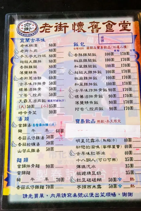 老街懷舊食堂 (宜花東暨離島) 網址: https://s.openrice.com/cHRSlm2PkW400 地址: 宜花東暨離島頭城鎮青雲路三段177號 電話: +886 039778199