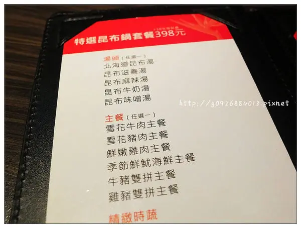 今日小柔要介紹王品旗下的餐廳<( ̄︶ ̄)/其中的「聚北海道昆布鍋」早在平價的石二鍋出現之前,早已聲名遠播與西堤、陶板屋、夏慕尼的餐點設計方式類似,從前菜、主鍋到甜點飲料多樣選擇加上親切的服務、舒適用餐環境<( ̄︶ ̄)>高貴不貴的選擇讓許多消費者一試成主顧 其實聚北海道昆布鍋的價格也相當平實,提供兩種不同價位套餐特選昆布鍋套餐 $NT.398元 的個人餐(需加10%服務費) 御賞昆布鍋套餐 $NT.796元 兩人食(需加10%服務費)小柔選擇了雙人套餐,可以選擇兩種湯頭(御賞昆布鍋套餐內容參考)湯頭(4選2)北海道昆布湯昆布滋養湯昆布麻辣湯昆布奶香湯主餐(2選1)季節海鮮拼盤嚴選主餐拼盤(牛拚/牛豬)精緻時蔬、梅子風味醋綜合季節創意拼盤(包含:牛、豬、雞、海鮮)副食(3選2)芝香白飯昆布烏龍麵日式芍粉甜品(3選2)桑葚晶凍奶酪蓮子銀耳釀(冷/熱)金字塔紅豆冰堡飲料(5選2)可樂、雪碧、蘋果西打、可爾必思冰沙、蜜桃紅茶(熱)沾醬部份,餐廳給了兩種:芝麻香甜醬、白蘿蔔泥佐日式醬油芝麻醬又香又甜,嚐了一口,口齒留香,沾火鍋料吃,別俱一番風味~( ̄▽ ̄)~*白蘿蔔佐醬油,清新又不會太鹹,夏天吃好清爽啊!湯頭小柔選擇:左為北海道昆布湯,右為昆布麻辣湯併成精緻的鴛鴦涮涮火鍋( ̄▽ ̄)/ 既然餐廳主打「昆布」,我們就簡單介紹一下~昆布是生長在寒帶海域的一種海藻,日本所食用的昆布約有 90 % 是產自北海道。昆布的品種可以用產地來加以區分,口感和味道都不相同因為不同的加工方式與料理種類,所使用的昆布種類也會有差異。 北海道昆布湯,湯頭清爽甘甜,實在難忘<( ̄︶ ̄)/昆布麻辣湯,麻兒夠嗆,但不會太辣!喜歡吃大辣的朋友,可以跟服務生要求加辣XD 套餐所附的精緻時蔬 飲料:蜜桃紅茶(熱)以及可爾必思冰沙(下左)中場服務人員會提供幫助消化解膩,可以無限續飲的梅子風味醋(下右)這也是王品集團餐飲常出現的品項<( ̄︶ ̄)> 綜合季節創意拼盤(包含:牛、豬、雞、海鮮)精緻的程度讓小柔為之驚訝啊!!!⊙0⊙ 嚴選主餐拼盤(牛拚)當天是板腱牛以及雪花牛雙拼老實說,服務生端出來的時候著實有點嚇到啦!因為肉片非常新鮮,重點又夠厚......<( ̄︶ ̄)>量又夠多!!! 整個就是料好實在啊! 牛肉片耐煮吃起來Q彈口感極佳,不沾醬也好鮮甜>///<芋頭煮爛,搗成芋泥,沾著肉片吃的自創吃法~也可以帶出牛肉片的甜味唷!當天小柔刷"花旗饗樂卡"(信用卡),所以有招待一盤天使紅蝦話說,招待的也太大隻了吧!!!! 大到令我傻眼啊!(⊙o⊙)a 另一方面又覺得王品系列的店也太大手筆啦!招待客人毫不手軟,難怪會穩坐餐飲龍頭的封號啊~~~(筆記)( ̄︶ ̄)> 天使紅蝦,鮮甜Q彈,滿滿的蝦膏,蝦頭非常鮮美有沉浸在海底的感覺ㄟ( ̄▽ ̄ㄟ)店家的火鍋料口味特別,與一般常見的用料有所不同品質較好,也極為紮實 ㄟ( ̄▽ ̄ㄟ) 鍋料種類多樣,份量恰到好處,吃完不會太飽…查看更多