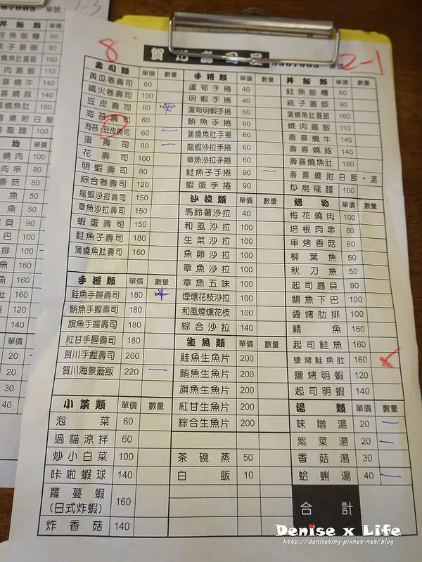 花連平價握壽司。生魚片。丼飯 愈來愈多人喜歡吃日本料理啦生魚片、握壽司、炙燒烤物等都是饕客們的最愛滿分們也是熱愛這一味的愛吃鬼花蓮小旅行也不忘要來享受哇沙咪嗆鼻的美味賀川日本料理屋是朋友們推薦好吃又平價的老店就讓我們來嚐一嚐這裡的鮮味吧 已經是晚上8點半多啦,滿分&Kevin開車流浪在花蓮市區今晚下著雨,本來應該好好的待在民宿休息就好但是愛玩的滿分就是覺得晚上應該要找點樂子堅持要Kevin帶滿分去逛個夜市,吃點小吃什麼的…坦白說,我們早已被『境外漂流』民宿裡的下午茶給餵飽了兩個人撐著肚子還是要到外頭找美食開車時,意外的看到賀川壽司屋,實在是太巧了剛好前一天Kevin的朋友才和我們推薦這間日本料理所以我們連想都沒想就決定下車來吃囉其實原本排定行程是要吃『花本家壽司』,但後來因為分家了所以才在這開了一間賀川壽司,但聽說即便分家,品質還是維持的很好PS:附近不太好停車,但來此用餐,店家門前可以暫停唷 抵達時已經晚上快9點了而且門口的營業時間是到晚上8點滿分還擔心會不會已經休息了呢一進門就先問還有營業嗎?很慶幸,服務人員還請我們入座呢不過看得出來,已經有點晚了,人潮也不多啦服務人員也開始作一些收納等清潔的工作 一樓的位置大概5~6組吧,滿分覺得沒有很多但還有二樓用餐區唷,只不過滿分沒有上樓去看啦拿到菜單看到好多打紅XX,不知道是不是因為快要打烊了所以很多食材都賣光了@@"還好滿分想點的都還有啦 鮭魚手握壽司 $180/份 (五個) Kevin最愛的握壽司上桌啦5個握壽司$180元算蠻平價滴賀川切的生魚片算很大片也特別長和kevin的十指差不多長唷,而且不會太厚生魚片上已淋上一層醬汁,聞起來很鮮很香滿分已經忍不住要開吃啦~~~您看看,滿分夾起來,這一片鮭魚比飯團還要大多呢搭配哇沙咪一起吃下去,那辛嗆的鮮味就是要吃生魚片才體會的到啦人間美味,滿分還蠻喜歡這樣的大小和厚度但Kevin比較喜歡厚切的生魚片,我們喜好不同,感受也不一樣啦味噌湯 $20元/碗日本料理除了美食之外,一定要來品嚐他們的湯品滿分額外點了一碗味噌湯,因為其他的湯都賣完了所以說是其他的湯比較好喝嗎??? 滿分不懂上桌看起來一般般,但用湯匙一撈發現裡面的餡料蠻多滴唷白豆腐和魚片呢,不過滿分們其實沒有太大的驚喜啦因為桃園的築地鮮魚,味噌湯品是免費提供,而且餡料也超豐富滿分覺得賀川一碗味噌湯,滿滿餡料,收費20元,也很合算湯品的味道還ok,但真得可以吃到很多的魚肉唷鮭魚子手捲 $90元/份 滿分非常喜歡吃鮭魚卵,咬破魚卵的口感超棒滴賀川的鮭魚卵手捲,滿分覺得賣相不佳啦可能是手捲內的生菜放比較少,所以撲上鮭魚卵就覺得量好少吃手捲的時候要小心嘿,別咬太快,一個不小心鮭魚卵就會全掉在桌上囉鮭魚卵真得很好吃,切記手捲類要趕快吃呀,海苔軟了就不好吃囉綜合生魚片 $200/份 (12片) 綜合生魚片好像比較有看頭耶有鮭魚、鮪魚、旗魚、紅甘四種生魚片等不及要先吃囉,一口一片剛剛好,很鮮嫩唷不過Kevin還是覺得切太小片了,吃得不過癮啦但今天吃的好開心,來訪花蓮還可以品嚐到平價的生魚片握壽司由於來賀川時,肚子其實已經很有飽足感了,所以就沒法點太多@@"但滿分發現賀川的菜單還有花壽司、丼飯和其他燒烤類耶好可惜,今天就無福消受啦,有機會再來將美食一網打盡囉…查看更多