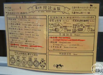 門口放著懷舊的零食玩具阿^^菜單 很用心呢店內好懷舊喔!!!! 而且弄的很好看呢!!!麻油雞湯(小70)味道真不錯 淡淡的酒香和麻油滋味 雞肉好嫩喔!油飯(小35)阿桂的油飯是使用池上的糯米 南投的香菇 台灣的金勾蝦米和花蓮本地的豬肉 味道很豐富啊他的豆花還蠻古棗味的 而且是使用非基改的黃豆!阿桂油飯的裝潢跟他賣的東西真的很搭啊 整個質感有做出來真不錯 味道也蠻不錯的 是一個很有特色的地方啊查看更多