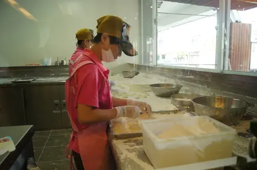 陳記麻糬位於台東市博愛路186號,外觀看來並不出奇,還有門口有大大的橢圓形招牌,才注意到這是店家而非一般住宅。 店門口鋪設著木造地板,左右各擺放著二張木桌木椅,放有少量的盆栽及一些古早味擺設如大竈及蒸籠。店家室內並不大,頭天造訪為早上九點左右,幾乎沒有其他客人,麻糬按種類分別放在櫃檯上,標明口味及價格,由客人拿著輕巧可愛的小竹籃,自行挑選喜歡的種類,我們很悠哉地閒逛挑麻糬。非常舒適自在。沒想到隔日下午再訪,人潮眾多,幾乎擠滿店面,麻糬幾乎全空,要稍等廚房人員現作上架,我們才真正見識了陳家麻糬受歡迎的魅力。 店內最受歡迎的人氣前三名分別是黑麻糬、麻糬餅、旗魚綠豆椪。 店面一側為廚房,從透明的玻璃櫥窗可以看到工作人員製作麻糬的過程,用布裝著剛做好的麻糬用力甩到工作檯上再分切小塊,那熱呼呼充滿光澤感,又細又滑的模樣讓我好想也摸一把…… 店旁有一區為台東特產的販售區,有茶、米、洛神花等。買好麻糬,我們直接到店外坐著享用。 店員還很客氣地奉茶請我們飲用,好貼心啊~(奉茶好像不一定,看店家心情XD)喝了一口,應該是台東特產的蜜香紅茶冷泡茶,喝得出清雅蜜香,搭配麻糬吃正好。麻糬以簡單的牛皮紙袋裝好。 繪有童趣圖案的手提紙盒要另外加購,印象中是十元一個。陳家麻糬為全素(旗魚口味除外),賞味期為2天。 黑土豆麻糬 17元我心目中的美味第一名,以黑糯米製成,有種特殊的米香,口感較白糯米更為Q軟有彈性,土豆即是花生,顆粒偏大,鬆脆、香甜。招牌黑麻糬 17元其實我不是很喜歡紅豆的人,但是這個紅豆內餡的招牌黑麻糬讓我大為改觀,紅豆餡香甜綿密,加上Q軟彈性的外皮,真的很棒。 花生麻糬 15元外皮是白糯米,細軟柔軟,有自然的米香甘味,內餡是磨成粉粒狀的花生粉,香而紮實,可惜稍嫌乾了點。 綠豆麻糬 15元綠豆內餡細滑,清甜爽口。 芝麻麻糬 15元內餡是香鬆帶點沙沙感的芝麻粉,香甜中帶些微微苦味。 旗魚鬆麻糬 20元我本來對鹹的麻糬很無感……但老公說這是招牌叫我一定要買,然後買了他又不吃叫我吃……(卑劣)結果一吃覺得還不錯欸~香滑細軟帶些微甜的麻糬,搭配鮮香鹹中帶甜的微酥魚鬆,滿好吃呢~這次造訪陳記麻糬,老實說我一開始並不抱太大期望,沒想到麻糬香滑軟Q,甜而不膩,黑麻糬更是彈性十足,好吃極了。讓我們一吃上癮,連續造訪二天。推薦給各位喜歡麻糬的朋友,有機會到台東一遊,千萬別錯過哦~…查看更多