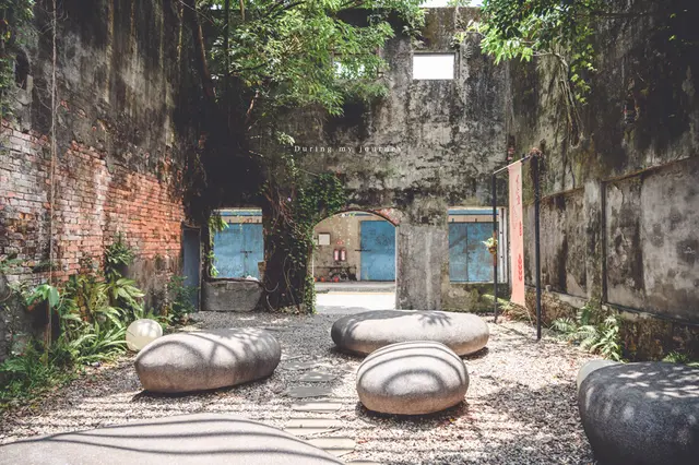 斑駁裸露的紅磚牆勾勒出歲月的痕跡,以天空當屋簷,陽光順勢流下的盡是斑斕光影,藤蔓雜草隨意的攀上建築,彷彿又喚醒了老屋的生命力,古亭穀倉在過去是碾米廠,經過荒廢一陣子後重新整理,請藝術家打造出融合碾米廠概念的藝術裝置,穀倉中央一顆一顆的大石頭便是米的各種形狀。