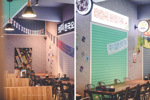 古亭穀倉-韓雞一號「倉尺洞」位在古亭穀倉旁,一棟清新可愛的鵝黃色建築與斑駁老舊的遺跡呈現強烈的對比,餐廳內的布條以及海報都是滿滿的韓文,頓時讓人誤以為走進韓國的餐廳裡。