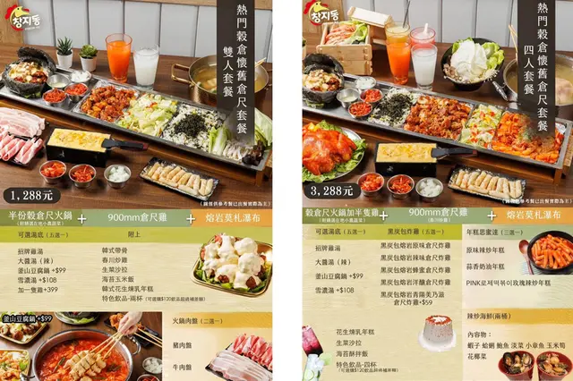 古亭穀倉-韓雞一號「倉尺洞」主打熱門穀倉懷舊倉尺套餐,有穀倉尺火鍋、倉尺雞、熔岩莫札瀑布,從雙人、三人、四人、七人套餐都有,不論兩人約會或多人聚會都有適合的選擇,也有提供單點的品項,像是各種口味的韓式倉尺炸雞、韓式炸醬麵、巨型包肉等等,另外也有飲品、果汁、韓式酒單