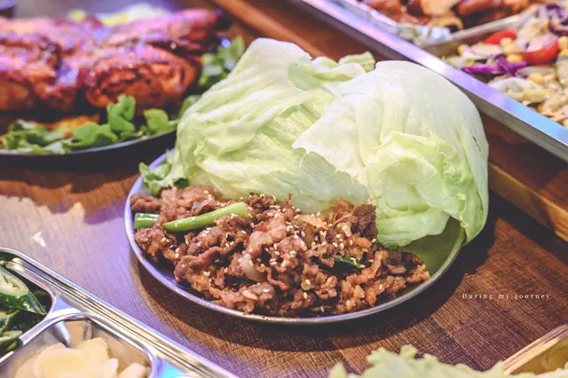 牛肉有特別經過醃漬處理,烤後肉質柔軟滑嫩、還散發著香氣,可以搭配綠椒、蒜片、洋蔥一同入口,牛肉的風味與生菜的清爽相互結合,能平衡口感上的層次。