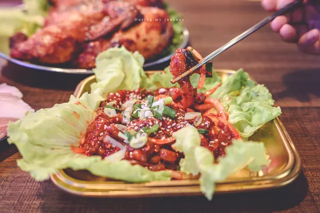 由於烤雞要先醃製三天較為費工,需要前三天預訂才可以品嘗到,韓式辣醬已經完美的融入在雞肉中,加上煙燻和炭烤的香氣讓軟嫩細膩的肉質更有風味,喜歡烤雞的人一定要來上一份。