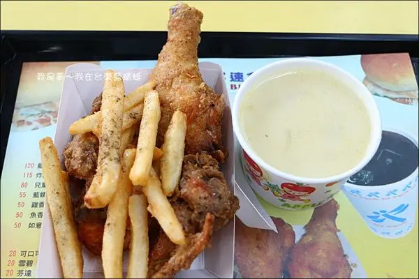 我們點了炸雞全餐115元,飲料加價換成玉米濃湯,薯條就一般沒什麼好說的,炸雞有點像是路邊攤賣的那種,雞腿較軟嫰多汁,雞塊跟我們一般認知的不同,不是一大塊,而是切了小塊帶骨的,玉米濃湯還不錯,整體上算不錯的,只是沒有到讓人吃了會想念,想再來的衝動。