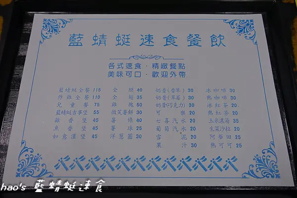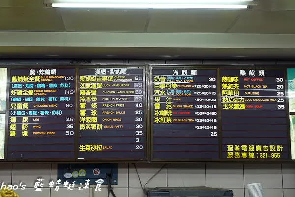藍蜻蜓主要販售炸雞類、漢堡、薯條、生菜沙拉、冷熱飲等。