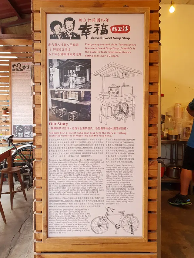 幸福綠豆湯創立於民國53年,是老台東人最愛的綠豆湯,以前的年輕人休假最愛到旁邊的大同戲院看電影,再吃碗冰涼消暑的綠豆湯,早期年代是阿公騎著腳踏車沿街叫賣,現今已經交由第三代接棒經營,濃厚的古早味+人情味,木造懷舊復古的氛圍很吸引人