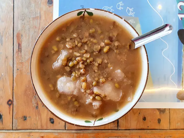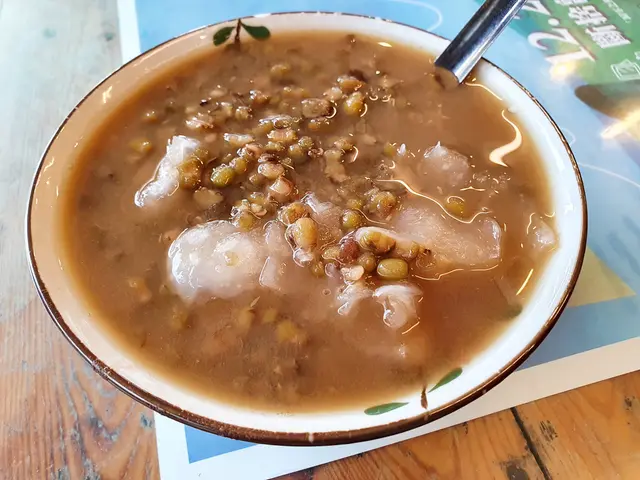 遵循古法熬煮到很綿密的帶皮綠豆,依然保有嚼感,很大一碗喝完很有飽足感