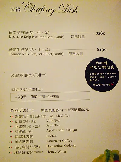 連火鍋都有了耶!!賣尬~~餐點一下子增加好多喔!無法一一拍照擺上來,還有蜜糖吐司下次下次。。。留著下次吃(這個需要提前預約喲!)