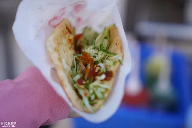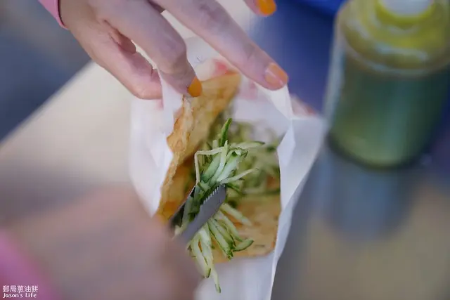 酥脆的蔥油餅加蛋,現場有免費的小黃瓜絲任你加
