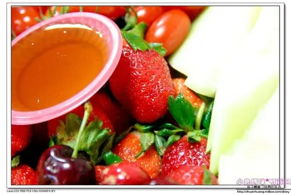 還有草莓,上面放的是蜂蜜,新鮮草莓沾蜂蜜一起吃,好好吃喔!