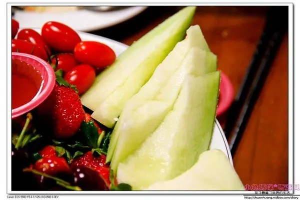 這是哈密瓜,甜度也非常高~旁邊的小蕃茄,表現也超好的,不但皮薄,而且很甜!話說我們一家大小都被飯後水果給收服了~~~