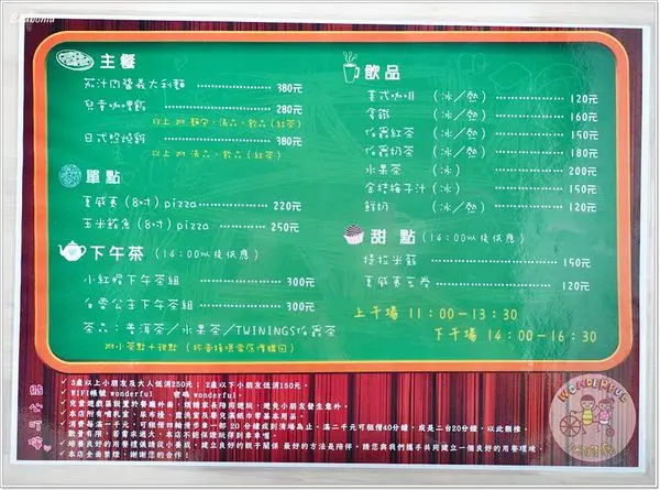 雖然樂高積木好玩,但填飽肚子也很重要,趕快來看一下餐點有哪些吧!餐點有主餐、PIZZA、下午茶、飲料、甜點,餐點價位以親子餐廳來說還算尚可。三歲以上有低消250元,2歲以下低消150元。