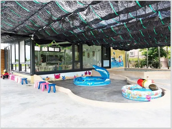 點好餐,來去餐廳外面看看餐廳的環境。餐廳旁邊就是玩水的地方,空間很寬廣,頭上還有蓬子遮陽,就算大太陽也不用怕曬黑!