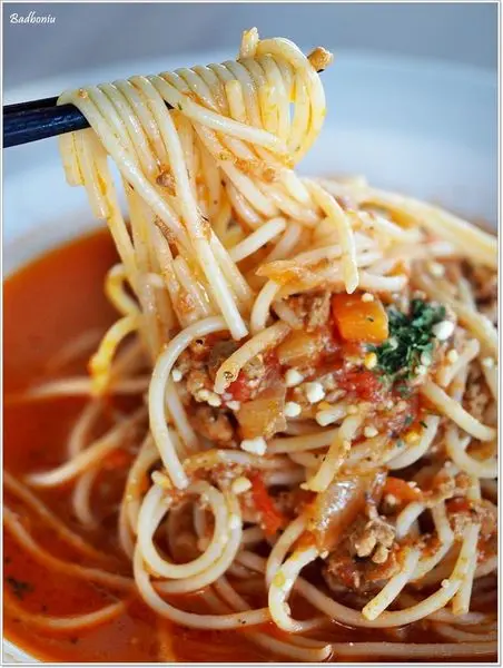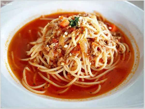 再來這一份是"茄汁肉醬義大利麵",紅通通的茄汁是小朋友愛的菜。