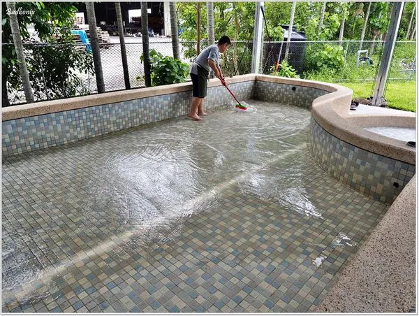 餐廳內的小朋友都一邊吃飯一邊關心著到底哪時才能玩水(笑)?要放水前,老闆會先將池子洗刷一下,很注重水池的清潔。
