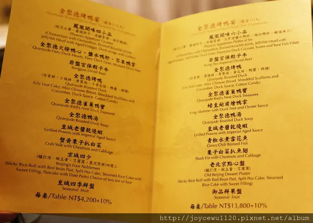 全聚德烤全鴨、全聚德火燎鴨心、鹽水鴨肝、芥末鴨掌、全聚德雀巢鴨寶、全聚德鴨湯等招牌菜色搭配其中