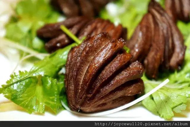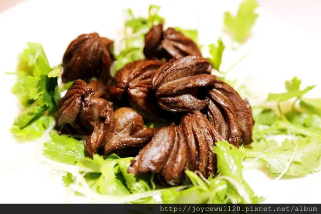 那細膩的刀工將鴨心切成漂亮的傘狀