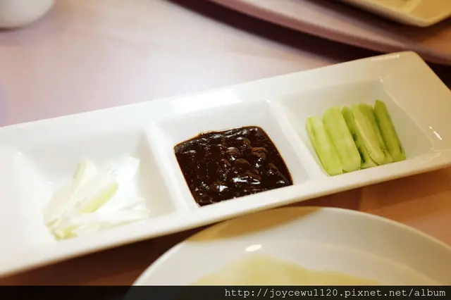 荷葉餅、甜麵醬、連皮帶肉一起食用