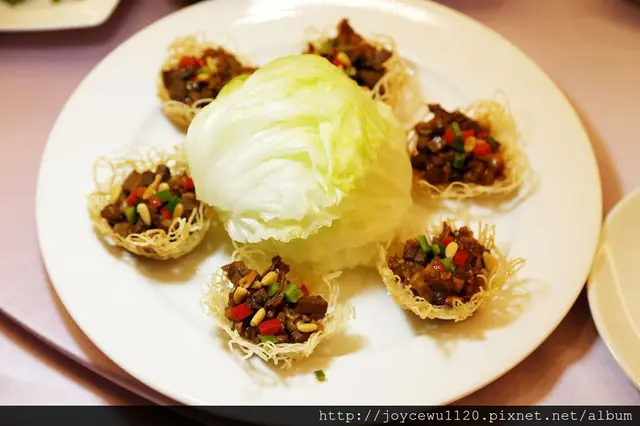 馬鈴薯炸成絲的鵲巢,當中包含鴨肉、鴨肝、去骨鴨掌、去骨鴨舌、豆干、松子等等