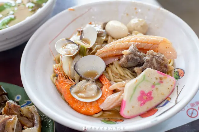 外面賣的排骨湯麵,有些是把排骨跟湯分開的,又或者是整個塊排骨放上去,這邊反而像是排骨酥麵,但它不是那種帶骨的排骨,帶骨真的不多,然後有炸過之後很吸湯,外層已經是泡到有一點爛爛口感,咬下去還是吃得到肉的感覺,但味道是偏重一些,沙茶是比較多,感覺是有油一些些,可是喝起來還是很清甜。