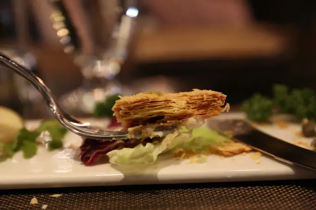 中間層是酪梨沙拉和超酥、超酥、超酥,因為很重要所以要說三次,這千層酥太over了喔!太好吃了!卡滋卡滋!