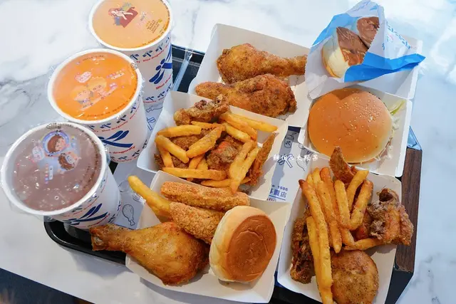 我們三種套餐都點了,另外加點兩支雞腿及一份餐包,剛剛好一個餐盤裝滿滿,跟一般速食店一樣要自行端餐