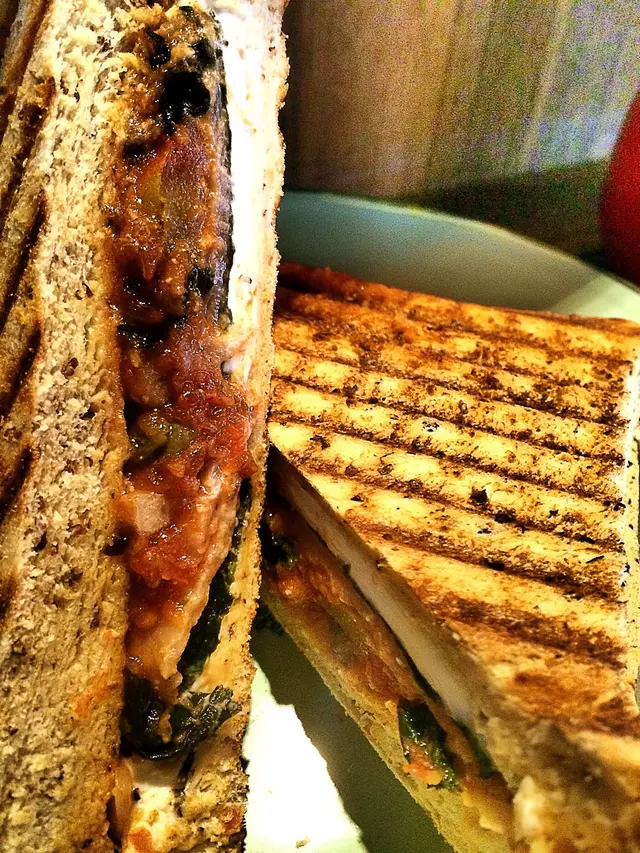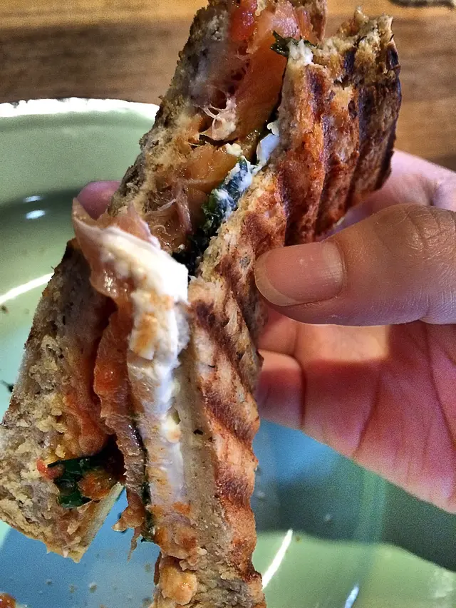 3~5分鐘後熱騰騰的帕里尼就送到我們面前,咬一口在嘴裡咀嚼,酥脆麵包保有麵粉的香氣,口感酥脆,厚厚的料搭上莎莎醬更為麵包加分,我好愛這種酥脆口感。這帕里尼沒兩下飢腸轆轆的兩人趁熱嗑光了。
