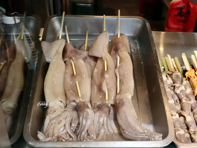 本來女漢子艾方妮想整隻魷魚拿來啃,但帥氣店員相當貼心地幫我們分解成一口大小,並搭配了兩種醬料及酸甜泡菜。
