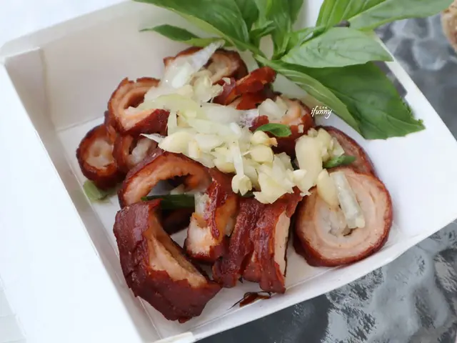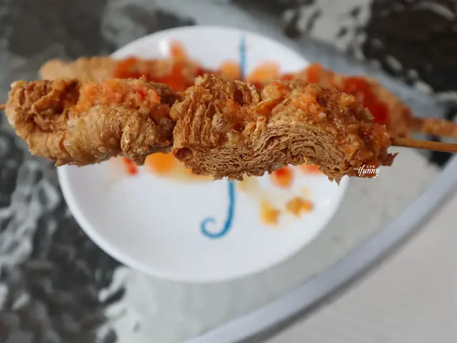 剛剛那個千層豆包,在炸過後酥香得不得了啊!咬下後咔滋的聲音也太悅耳了,其上淋上的是香蒜醬,更是引人食慾。